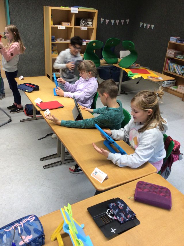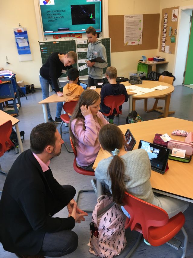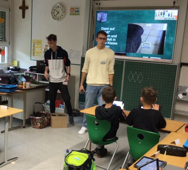 Dr. Frederik Linn, der das Projekt gemeinsam mit Jennifer Voß begleitete, erklärt: „Die erfahrenen Schüler haben das super gut vorbereitet. Wir Lehrer haben nur noch Kleinigkeiten ergänzt.“ Je zwei Medienscouts für die Klassen 3 und 4 haben an den Grundschulen interessante Themenblöcke unterrichtet: In der Klasse 3 standen geeigneten Suchmaschinen und YouTube-Kids für das sichere Erkunden des Internets im Mittelpunkt sowie das iPad mit dem Apple-Pencil als Ergänzung zum klassischen Schulheft. In Klasse 4 wurden kurze Videos gedreht und erste Computerspiele programmiert, bevor mit sogenannten Merge-Cubes die nächste Dimension, die Augmented Realitiy, erobert wurde.