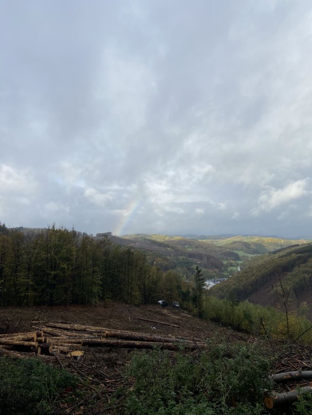 Das Bild zeigt im Vordergrund die aufgrund der Borkenkäfer-Kalamität gerodete und größtenteils aufgeräumte Fläche Nadelwald und schräg rechts in Hanglage ein kleines Areal mit Birkenbäumen, was nach Kyrill sich selbst überlassen worden war. Dieses Stück Land insgesamt ist im Besitz von Herrn Bieke.