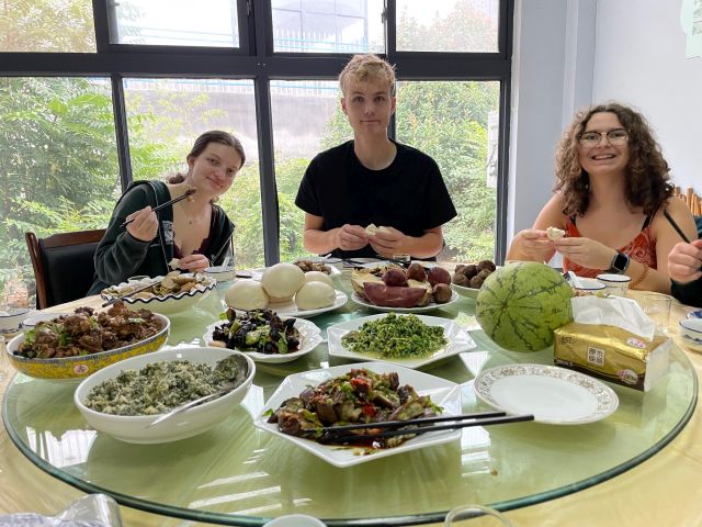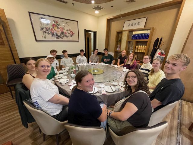 Am Donnerstag besichtigten wir das Museum zum Ersten Weltkrieg mit den alten deutschen Bunkeranlagen. Besonders spannend waren die historischen Zeitungen und Postkarten aus jener Zeit. Danach ging es zu einem nachgebauten buddhistischen Tempelkomplex mit traditionellen chinesischen Gebäuden. Den Abend ließen wir individuell ausklingen, wo wir bei leckerem Essen und Musik Zeit mit unseren chinesischen Partner*innen der Thomas School verbrachten, ein besonders schöner Abschluss des Tages.
