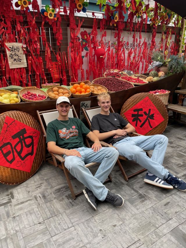Am 27. September startete unsere Gruppe von 15 Schülerinnen und Schülern früh morgens an der Akademie Biggesee. Mit dem Bus ging es zum Frankfurter Flughafen und nach einem rund neuneinhalbstündigen Flug erreichten wir Peking. Die Einreise verlief mit Fingerabdruck-Scan und Sicherheitskontrollen etwas aufwändig, wobei auch einige Powerbanks leider abgegeben werden mussten, doch schließlich saßen wir im Anschlussflug nach Qingdao. Dort wurden wir herzlich von MaShan, dem Leiter der Thomas Foreign Language School, abgeholt und direkt in ein landestypisches Restaurant gebracht, wo wir unser erstes authentisches chinesisches Essen probieren durften. Anschließend fuhren wir weiter zur Grand International School, wo uns die chinesischen Schülerinnen und Schüler bereits begeistert aus den Fenstern zuwinkten. Unsere Koffer wurden freundlicherweise in den vierten Stock getragen, und kurz darauf begann die feierliche Opening Ceremony. Zur Begrüßung erhielten wir Freundschaftsarmbänder und suchten uns chinesische Namen aus, die ebenfalls auf Armbändern verewigt wurden. Bei kleinen Icebreaking-Aktivitäten und Spielen lernten wir unsere chinesischen Partner kennen und kamen schnell ins Gespräch. Nach dem Abendessen in der Cafeteria erkundeten einige noch das Einkaufszentrum in der Nähe, bevor wir auf die erstaunlich harten Betten des Internats fielen. Einmal-Bettwäsche und Einmal-Handtücher sorgten für eine etwas ungewohnte, aber durchaus amüsante Erfahrung.