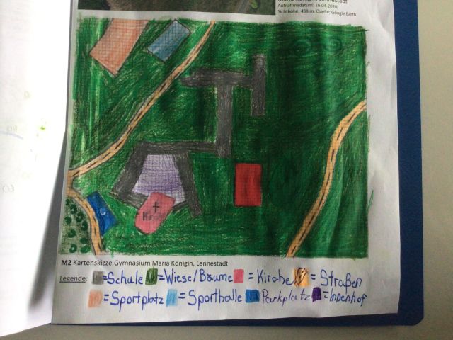 Fazit: Ein Luftbild zeigt, wie die Schule wirklich aussieht, während eine Karte zeigt, wo etwas liegt und wie die Dinge zueinander angeordnet sind. Beides ist nützlich – das Luftbild hilft beim Erkennen, die Karte beim Orientieren. Viele schöne Ergebnisse sind entstanden. Nach einer intensiven und demokratischen Abstimmung könnt ihr nun die beiden schönsten Exemplare der Klasse 5b (Katharina Allebrodt und Sofia Weber) betrachten – viel Spaß!