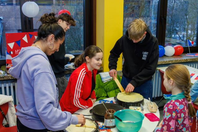Die Klassen 7 boten Würstchen, leckeren Kuchen und Getränke an und auch in der neuen Mensa gab es mit Currywurst und Kaiserschmarrn etwas zum Probieren.
