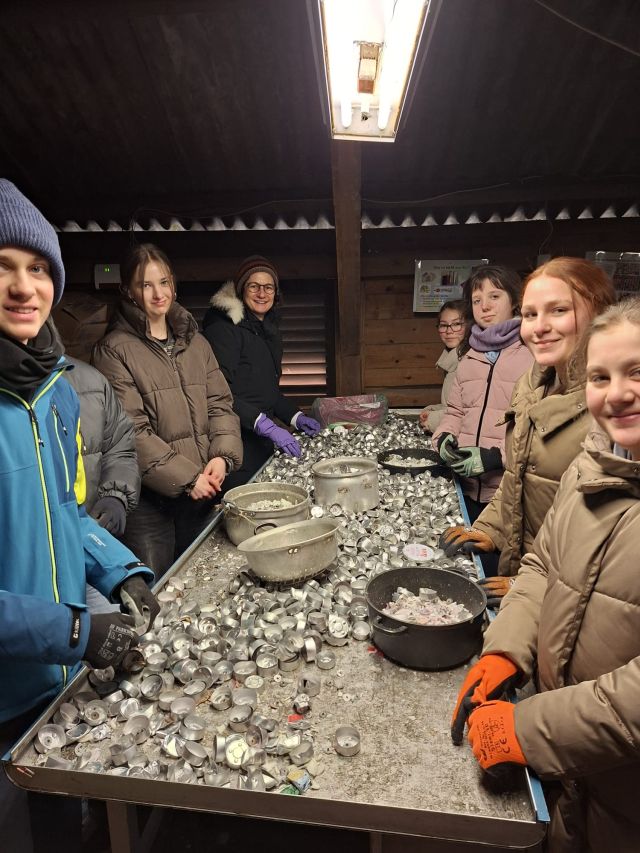 Ein ganz anderes, aber nicht weniger wichtiges Ziel verfolgten rund 35 Schüler in der Alu-Scheune. Dort sortierten sie Aluminium, dessen Verkaufserlös Projekte des Vereins Servir e.V. unterstützt – unter anderem Hilfsprojekte in Kenia. So wurde der Wintersportwandertag auch zu einem Tag des sozialen Engagements.