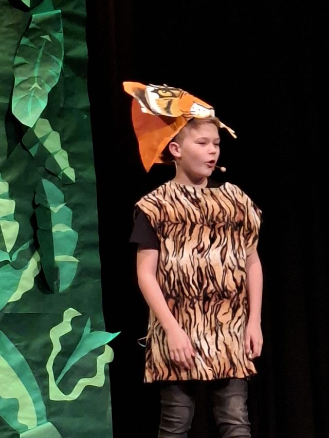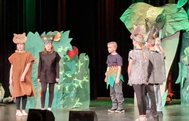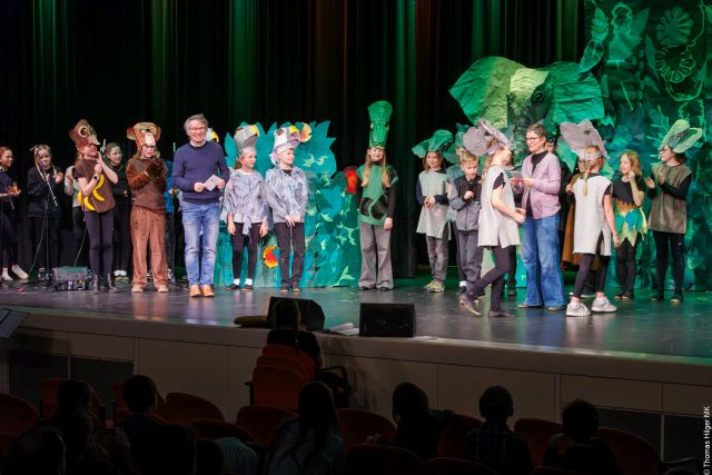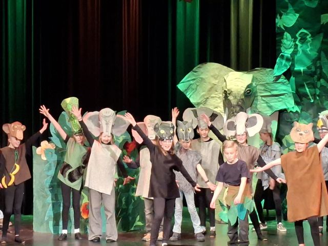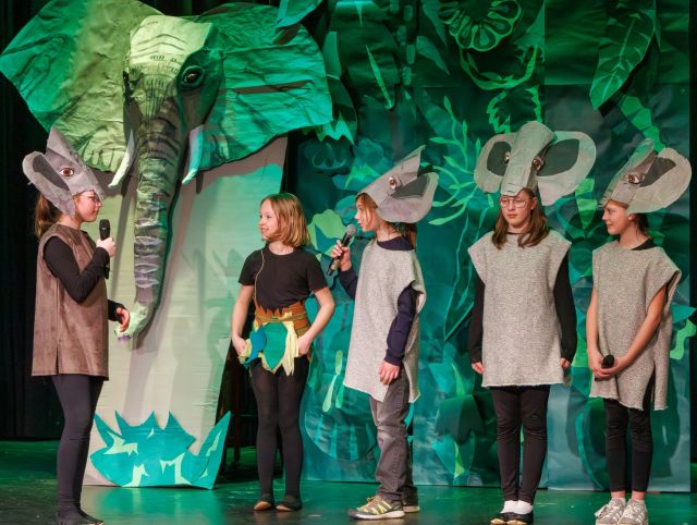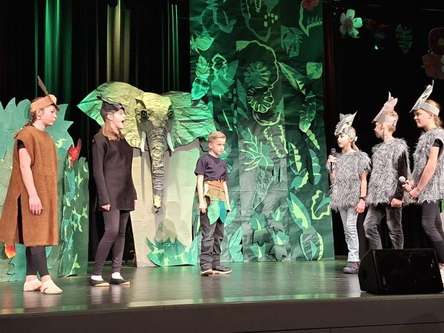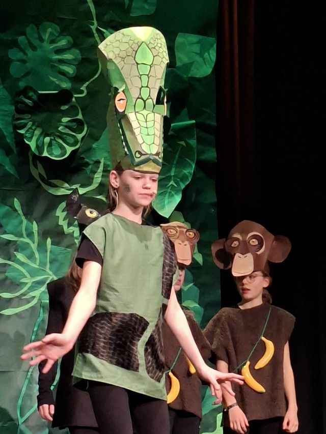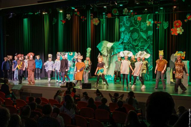 Diese spannende Geschichte wurde von allen Beteiligten mit schwungvollen Liedern und kreativen Kostümen präsentiert. Die Zuschauer fühlten sich durch das mit viel Aufwand erstellte Bühnenbild (Marlene Skala) tatsächlich in den Dschungel versetzt, auch weil die Darsteller die Tierstimmen täuschend echt nachahmten. Neben den Schülern der Unterstufe wirkten die Musicalband unter Leitung von Berthold Kresin und Schüler der Technik-AG aus den Klassen 9 und 10 unter Leitung von Martin Berens mit.