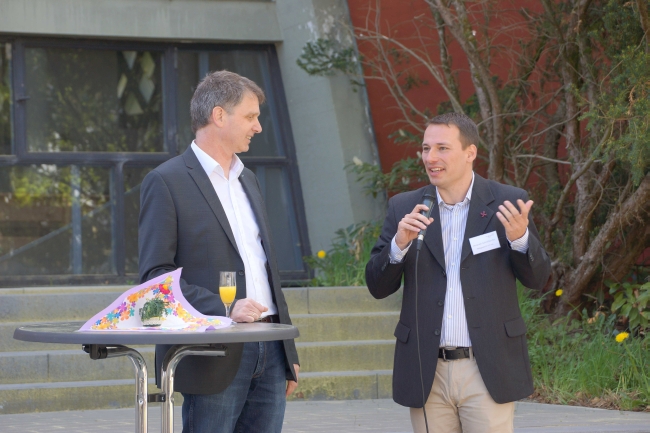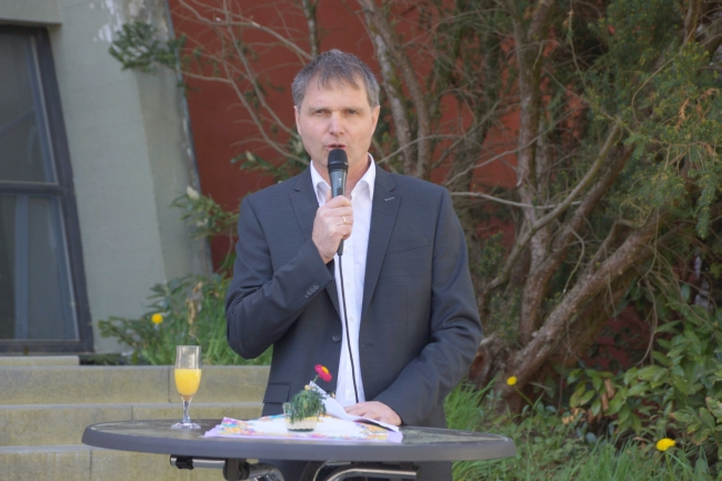 Die enge Verbundenheit und die gut angelaufene Kooperation von Jugendhof und Gymnasium wurde auch beim anschließenden Festakt im Innenhof des ehemaligen Klosters von allen Beteiligten gelobt. Andreas Bölker richtete als Vorsitzender des Trägervereins ein Grußwort an die Gäste aus Kirche, Politik, Schule und Jugendarbeit, in dem er hervorhob, wie glücklich der Träger über die neuen Nachbarn sei. Als kleines Geschenk überreichten Schulleiter Berthold Scheime und der künftige stellvertretende Schulleiter Christoph Tebrügge ein Fahne mit dem Logo des Jugendhofes. Neben zahlreichen Lehrern und Lehrerinnen und Vertretern des Trägervereins nahm auch der neue Schulleiter Fabian Borys an der Einweihung teil.